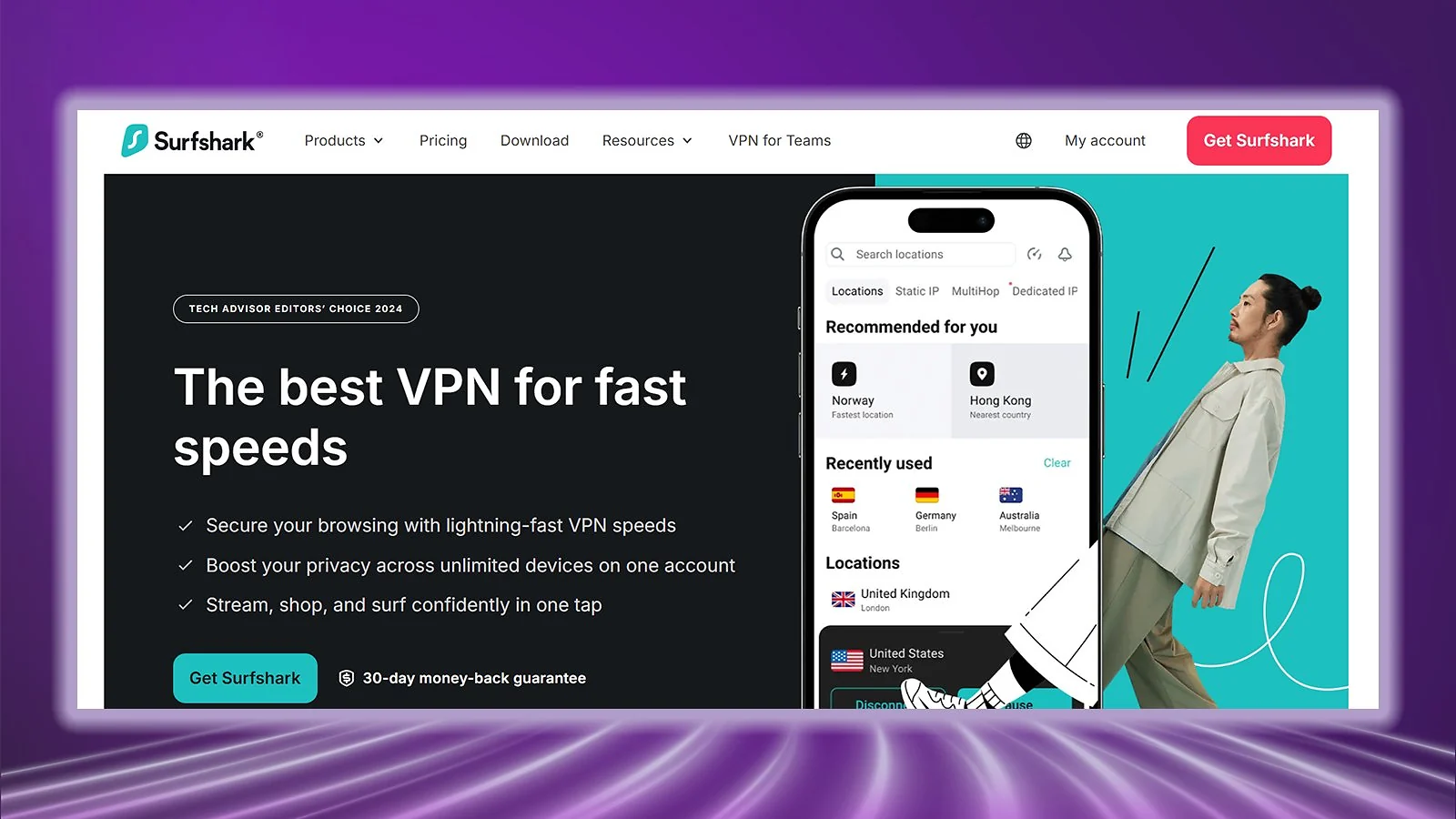 - Surfshark – Budget option with no-lag VPN servers in 100+ countries. Competitive ping results, unlimited devices, and fast WireGuard speeds.